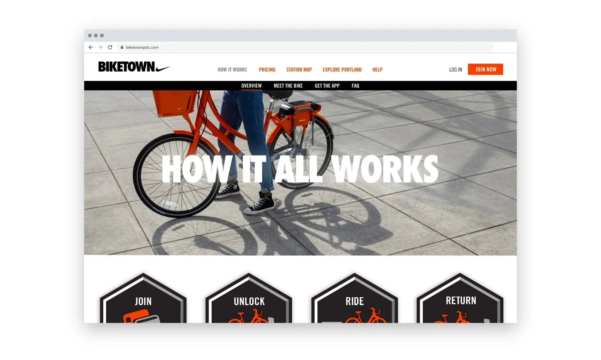 I developed a visual identity system that gave BIKETOWN a bold, recognizable presence across the city. The Nike-inspired orange palette and custom typography translated into a design system flexible enough for bikes, stations, print collateral, and digital campaigns.