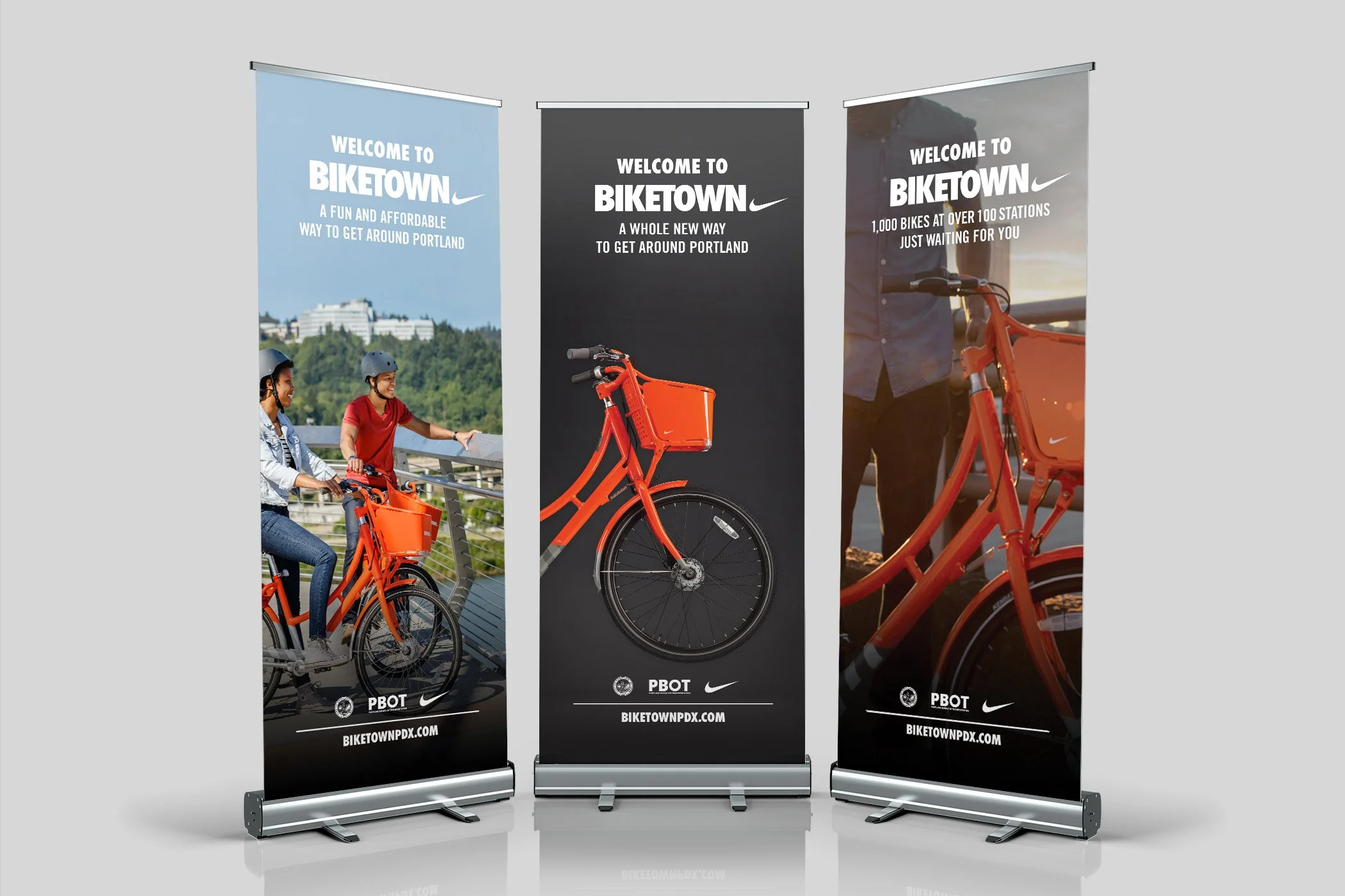 When Portland launched its first major bike share system, BIKETOWN, Nike stepped in as lead sponsor. The project needed an identity and campaign toolkit that could live on bikes, kiosks, stations, and city streets—and feel instantly Portland. I led the creative, building the visual system and launch materials that took BIKETOWN from idea to in-market reality.