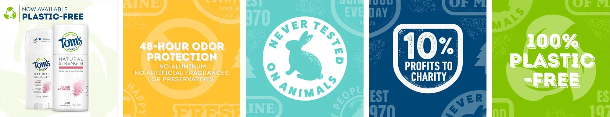 I adapted the badge system into store signage, endcaps, table toppers, and promo pieces, keeping typography, icon language, and tone aligned with the refreshed look. In parallel, I built digital banners, social cut-downs, and ecommerce imagery for retailer PDPs, so shoppers got the same values-led story online that they saw in-store. The throughline focused on simple, optimistic claims (e.g., “Small Steps,” “Everyday Good”) paired with unmistakable Tom’s cues.