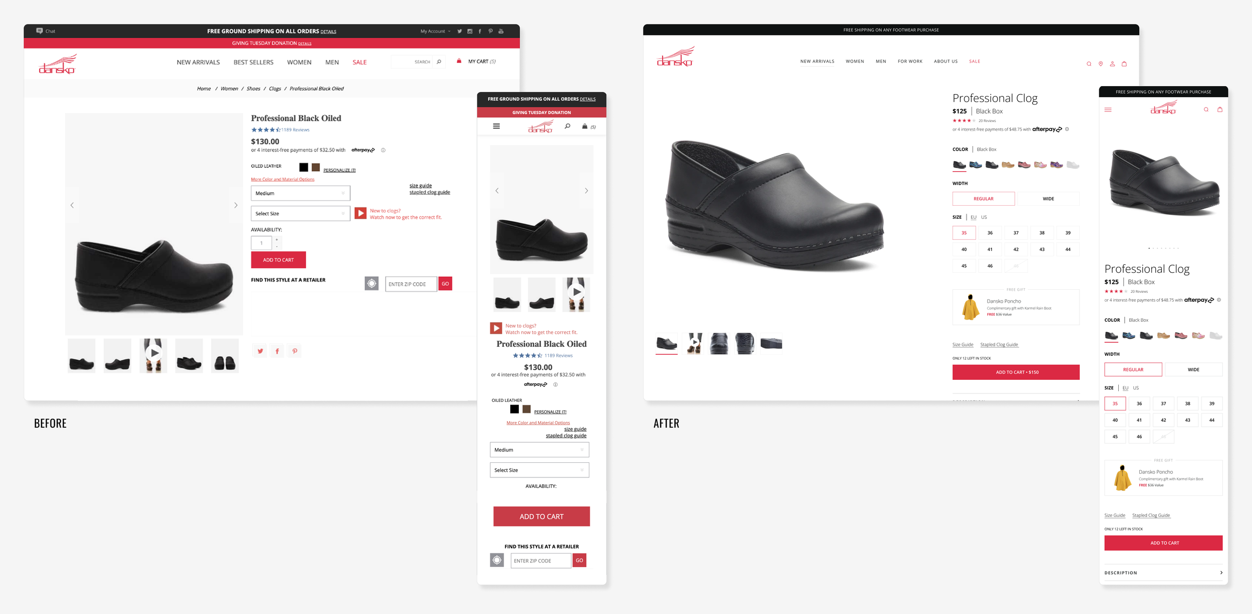 I redesigned the site end-to-end, starting with simplified navigation and improved product categorization to help users find what they need faster. PDPs were restructured to support clearer storytelling and stronger conversion opportunities. Across the site, I applied best practices in ecommerce UX, elevating Dansko’s brand story while weaving in user stories and social proof.